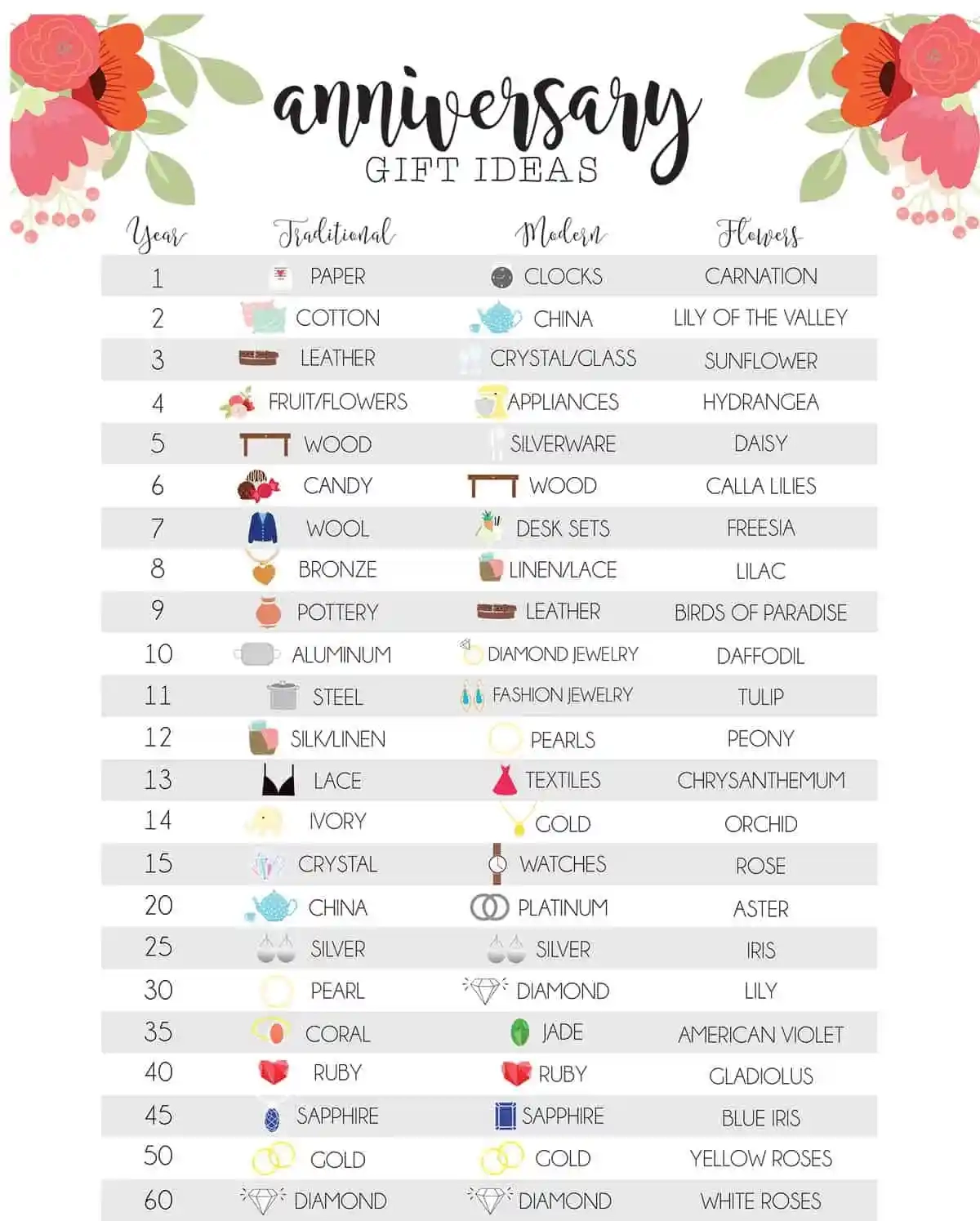 For those reaching their fiftieth anniversary, the traditional gift is gold. Consider giving a piece of gold jewelry or a gold-plated watch to mark this significant milestone. No matter which year you’re celebrating, our printable list has you covered with thoughtful and creative gift ideas.