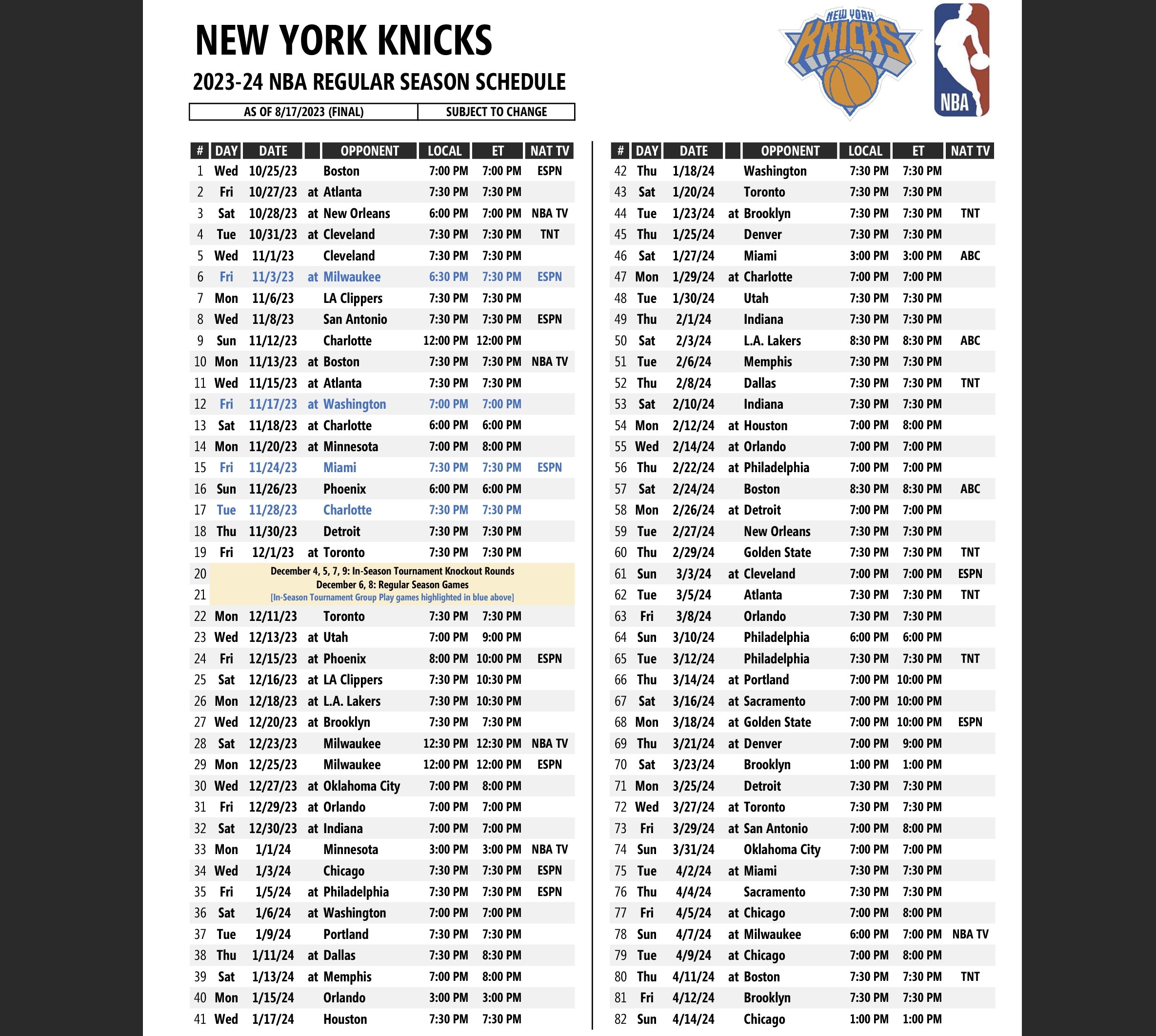 New York Knicks Printable Schedule