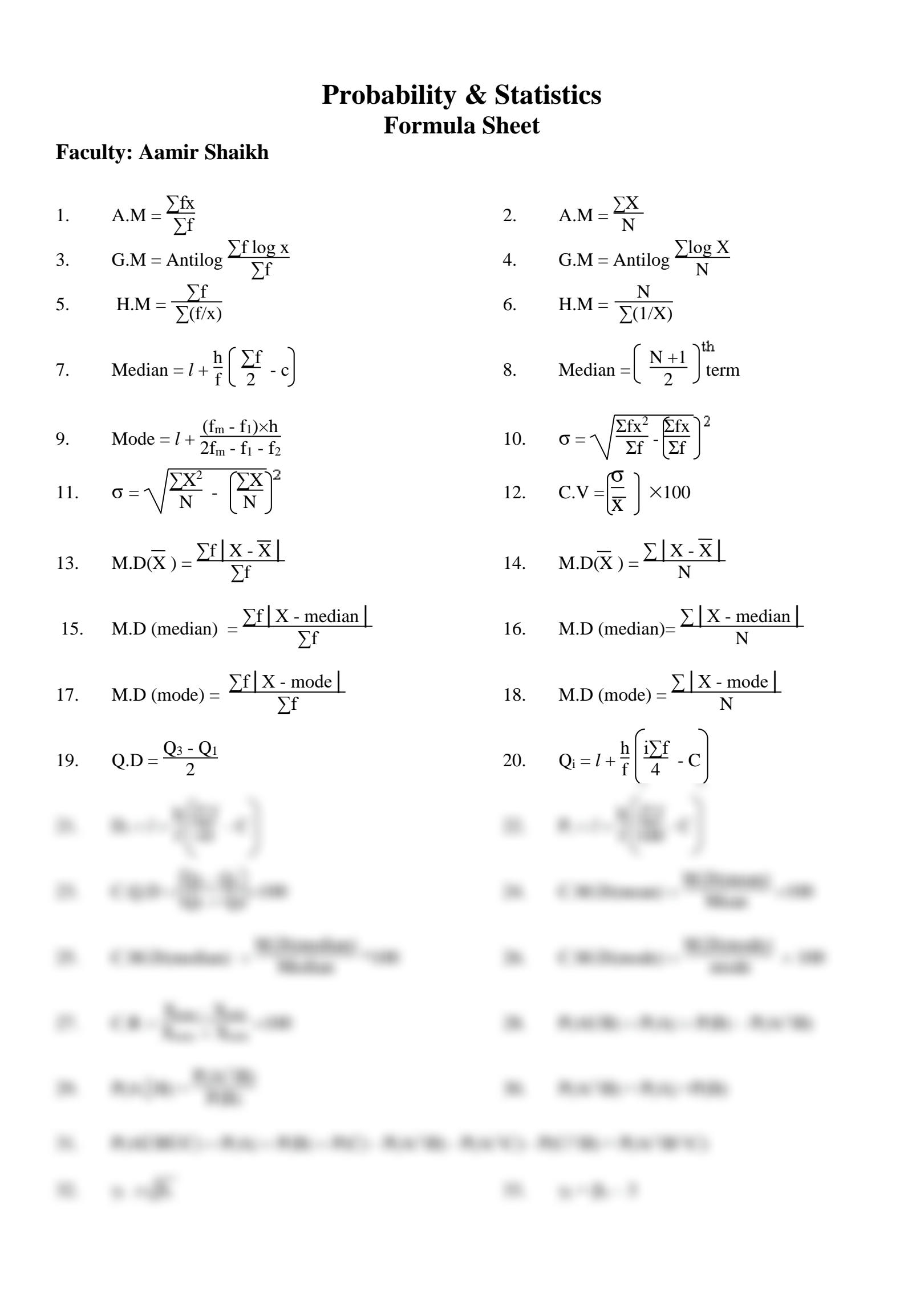 Printable Probability And Statistics Formula Sheets